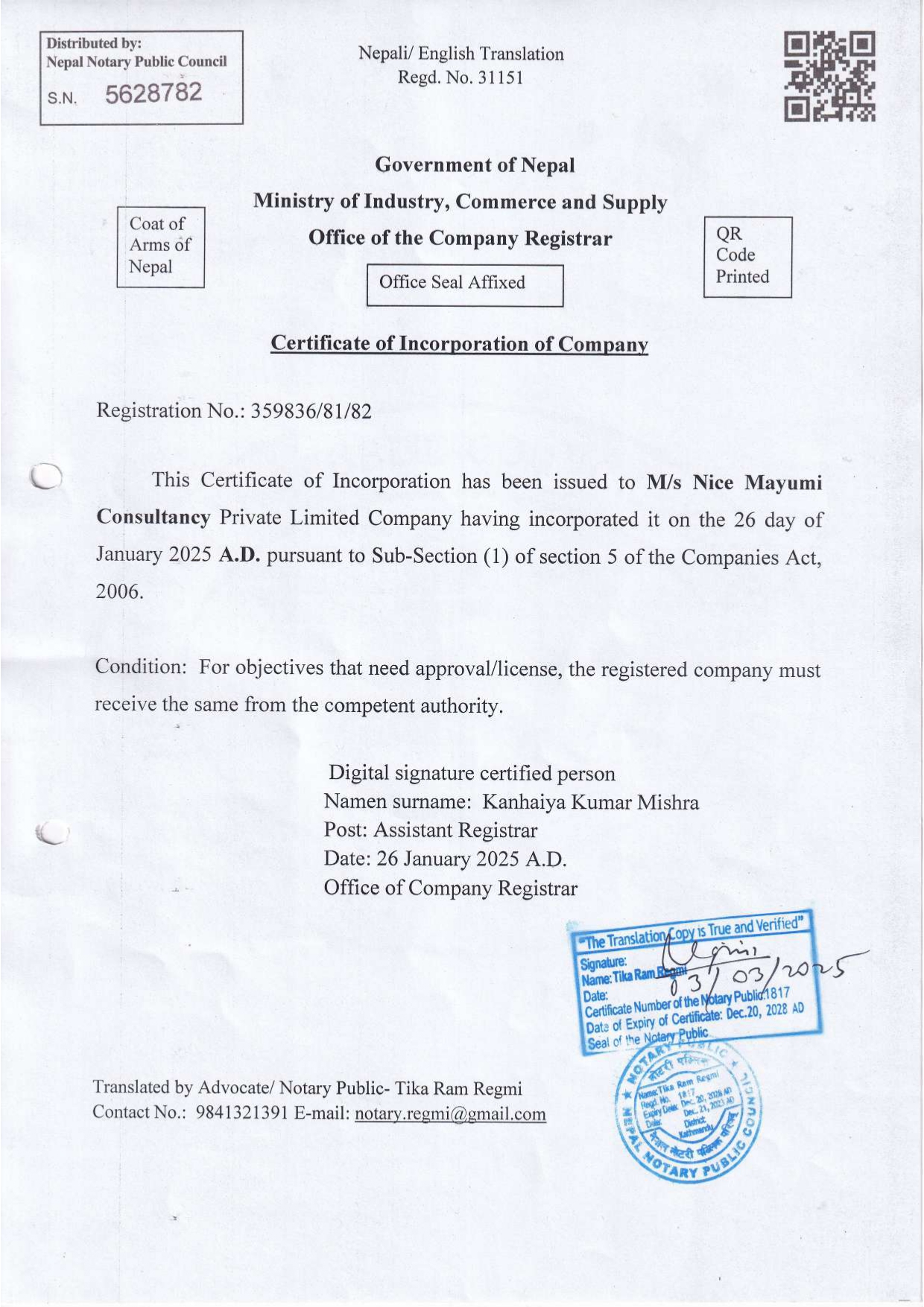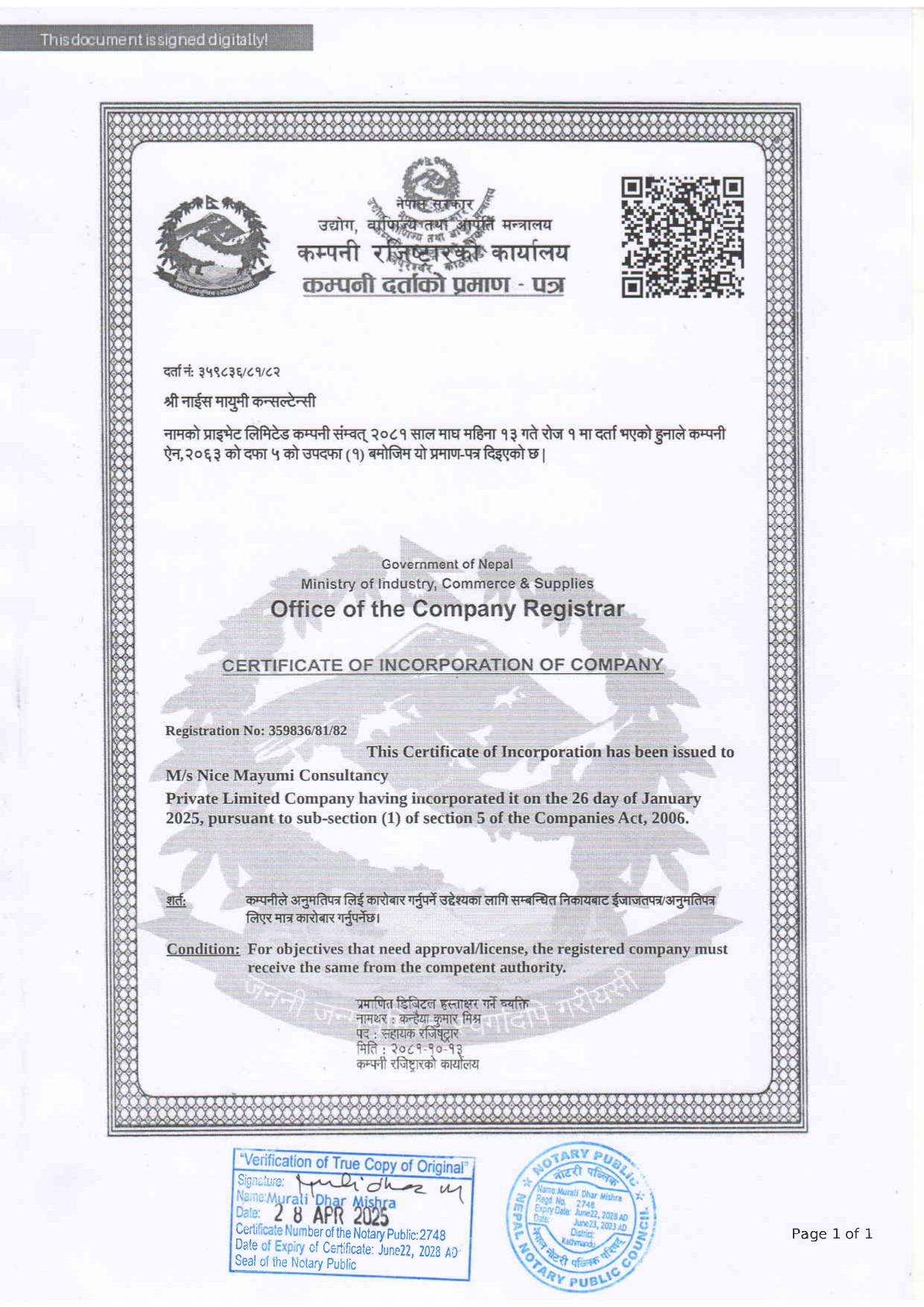Our company is officially registered under the Companies Act, 2063 (2006). This certificate confirms our legal status as a private limited company in Nepal.